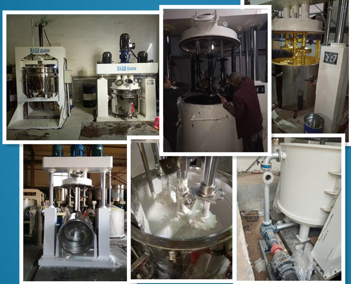 是一種多功能、強制性攪拌機,釜內有三根不同形式的攪拌器,其中一根低速攪拌器在繞釜體軸線轉動,其余兩根高速攪拌裝置又以不同的轉速繞自身軸線高速自轉,使物料在釜內作復雜的運動,受到強烈的剪切和混合。設備內山形刮壁刀繞釜體軸線轉動,將粘在壁上和底部的原料刮出參與混合,使其效果更為理想。設備密封性好,可電加熱(水冷卻)抽真空,具有良好的排氣除泡。強力分散機缸蓋可液壓升降,缸體可自由移動,操作十分方便。強力分散機攪拌器的形式,根據物料要求可為多層槳葉式、框式、蝴蝶式、葉輪式等。攪拌機通常配套系列液壓擠出機,以實現膏狀物料的擠出。